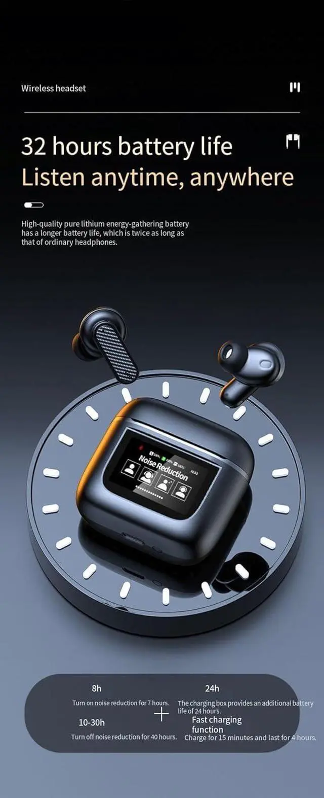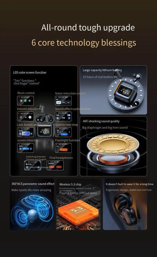 LED Power Display & Multi-functional ButtonThe charging case features an LED display that shows the remaining battery power, as well as the charging status of the bluetooth wireless earphones. An LED display keeps you informed about the battery reserves. The open ear wireless bluetooth headset features a multi-functional touch button that control of various functions. You can effortlessly play or pause music, skip tracks, answer or end phone calls, and activate voice assistant
