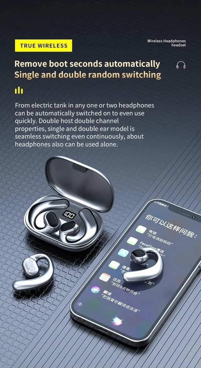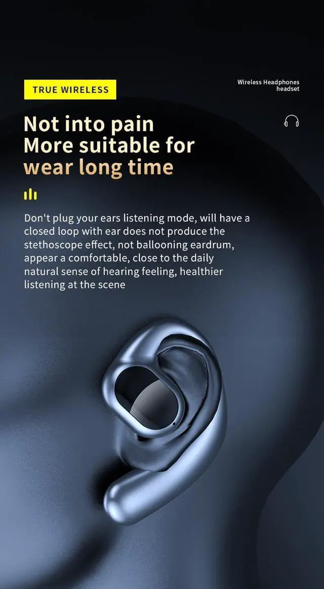 Open Ear HeadphonesOpen-ear design achieves superior music experience and buds-free, compared with in-ear or bone conduction headphones. No blockage of the ear canal, and no pain or damage to hearing. Wear securely and comfortablely on your ears, perfect for running, workout, and outdoor sports