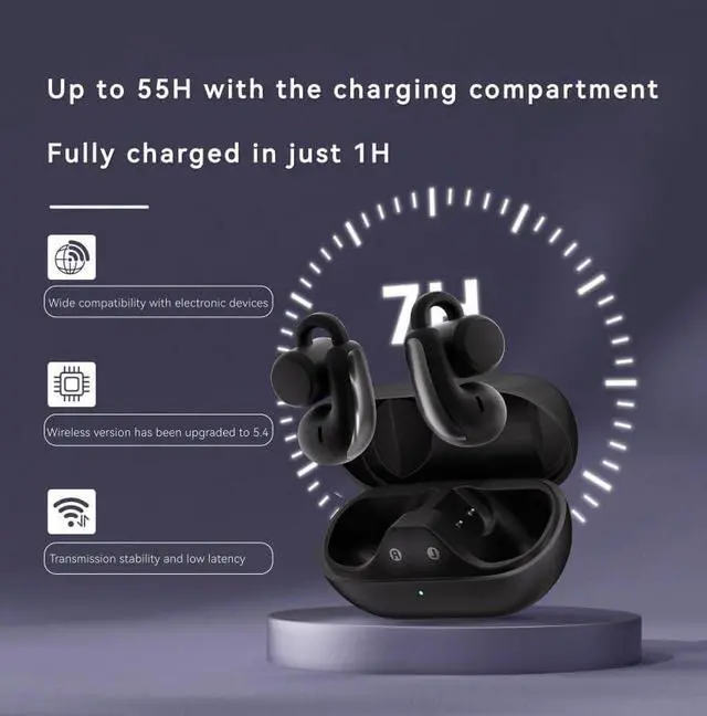 [Low power consumption, Long battery life] New 5.4 chip + enhanced battery, low power consumption and long battery life, enjoy catching up on TV programmes and playing games. Air conduction headphones bluetooth clip up to 55 hours of binaural playback time when using the charging case.