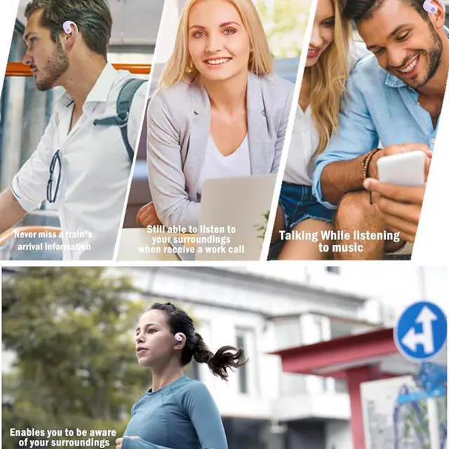 Comfortable Open Ear HeadphonesThe wireless bluetooth earbuds feature open-ear design. Compared with other in-ear earbuds, open-ear design makes the earbuds more comfortable and secure to wear, avoiding potential ear fatigue or infection even after long using. Without neck wire, the open ear earbud is suitable for all people, whether you have long hair or wear glasses.