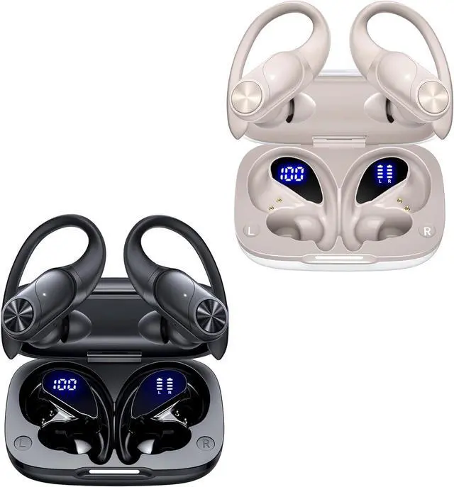 2 Sets Bluetooth Headphones Wireless Earbuds 80hrs Playtime Wireless Charging Case Sports Ear buds with Earhook Premium Deep Bass IPX7 Waterproof Over-Ear Earphones for Phone Laptop Black + Pearl Gray