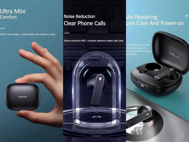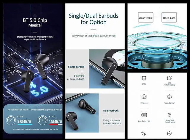 Functionalities (1) Touch Functions. Equipped with the smart touch functionality providing a stress-free, easy to use wide variety of functions including stop, play, power on & off, forward, etc (2) Auto Pairing. No hassle of connecting to the device every time. Take them out of the charging case to connect to the device automatically. (3) Dual Microphone. The Dual Microphone technology gives the user freedom of connecting each earbud independently to separate devices (including phone calls).