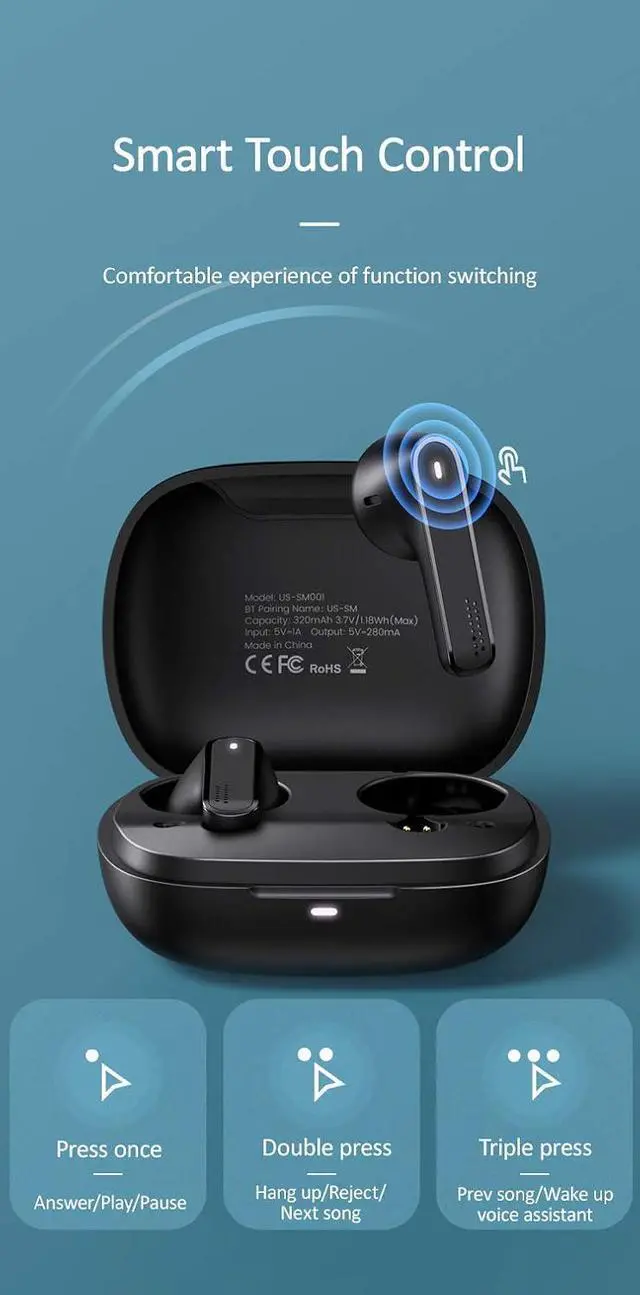 Functionalities (1) Touch Functions. Equipped with the smart touch functionality providing a stress-free, easy to use wide variety of functions including stop, play, power on & off, forward, etc (2) Auto Pairing. No hassle of connecting to the device every time. Take them out of the charging case to connect to the device automatically. (3) Dual Microphone. The Dual Microphone technology gives the user freedom of connecting each earbud independently to separate devices (including phone calls).