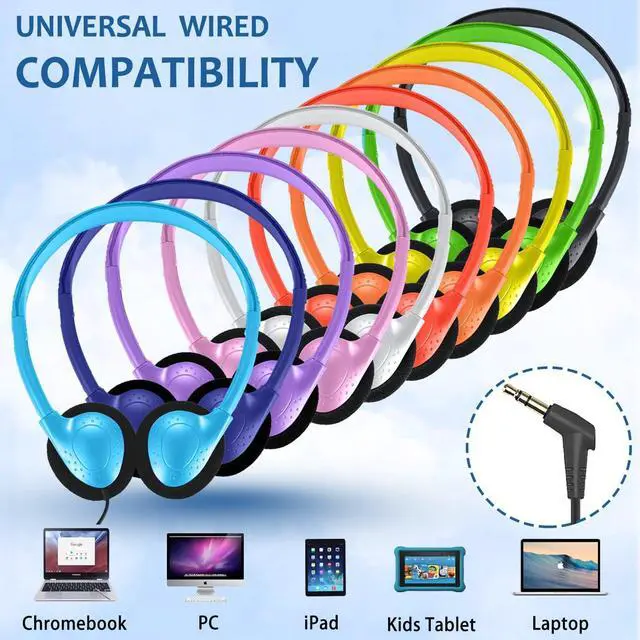 Bulk headphones for classroom with a 3.5mm jack that kids can plug into Chromebook computer laptop.