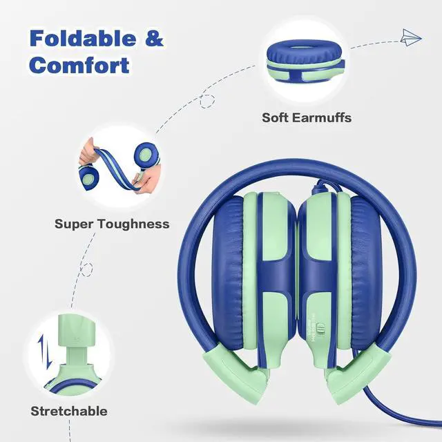 Kids Headphones with Distinct Volume LimitedAdopt exclusive proprietary 3-level volume limiter(75dB/85dB/94dB) to protect vulnerable and sensitive ears, which fit various ages and environment. 2 superior speakers provide crystal clear sound.