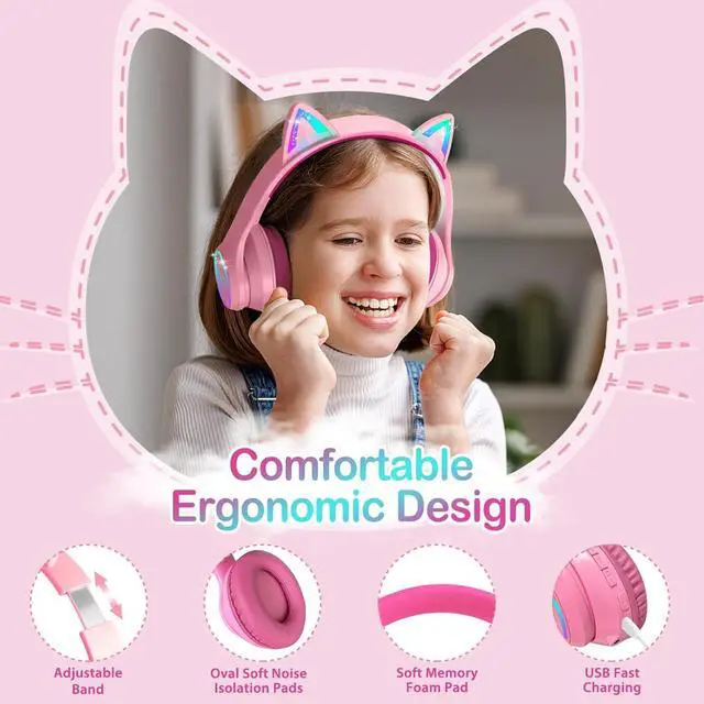 Designed for Kids & ComfortAdjustable headband is suitable for kids and teenagers of different ages, allowing kids to wear it firmly without feeling any pressure on their ears, and the soft ear cups wrap around the ears to isolate them from outside sounds while achieving the perfect listening effect.