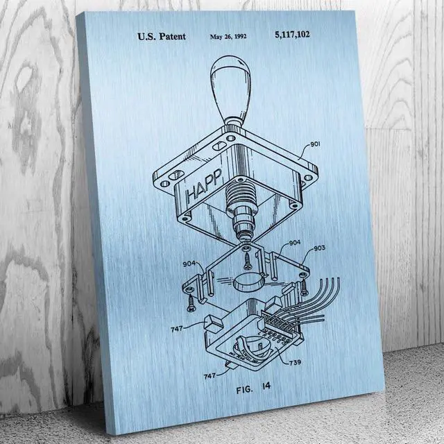 12" x 16" Canvas art print featuring a Arcade Game Joystick patent illustration on a Blue Steel style background. Designed by Patent Earth, this wall art is made to order and customized with your choice of size and background!