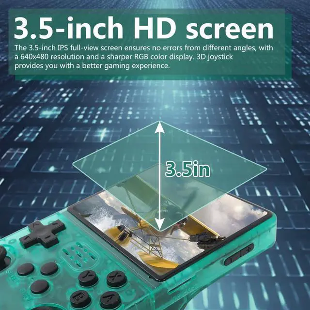 3.5-inch IPS tempered glass screenThis retro game console is equipped with a 3.5-inch IPS full-viewing angle screen, ensuring that nothing goes wrong at different angles, with a 640x480 resolution and clearer RGB color display.The screen is made of tempered glass which has better wear resistance and is more suitable for long-term use