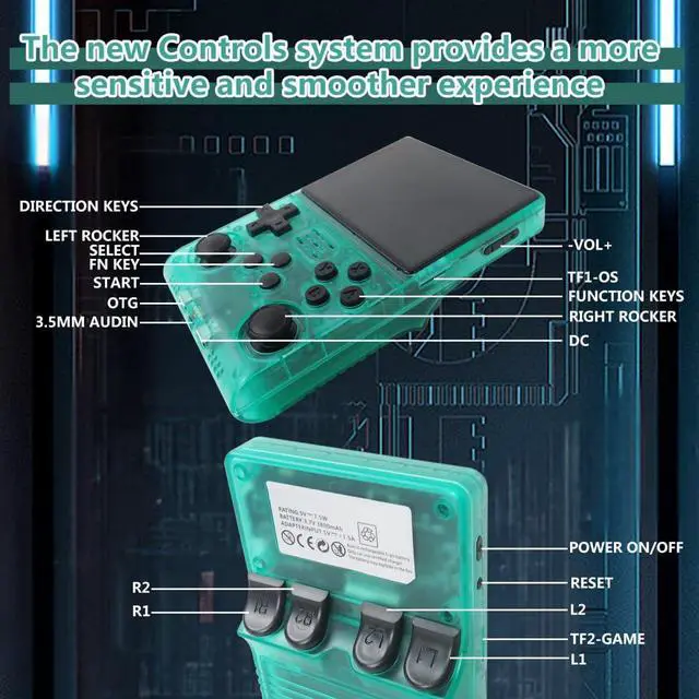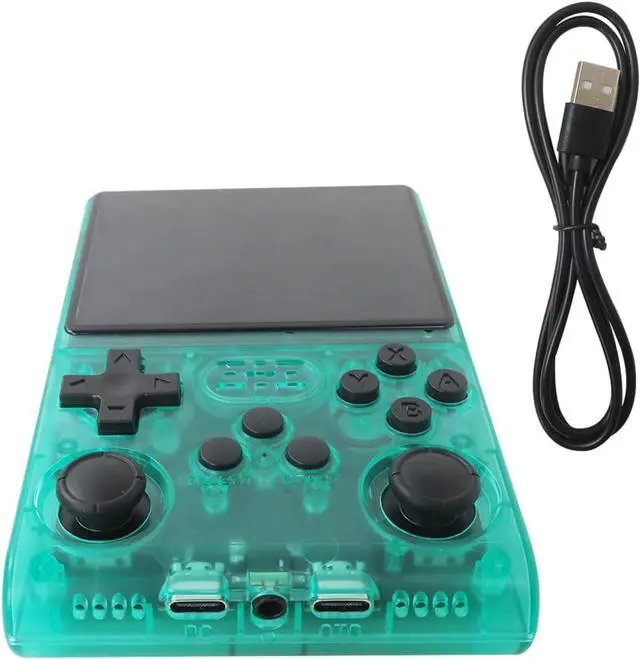R40S PRO new systemThis handheld game console is equipped with 1.5GHz 64-bit RK3326 CPU, Mali-G31MP dual-core GPU, 4GB*2 RAM DDR3L; the new operating system provides a more responsive and smoother experience. It can also be connected to a large screen or controller for home use via a Type-C-OTG adapter, and features a built-in speaker, dual 3D joysticks, and a 3.5mm headphone jack