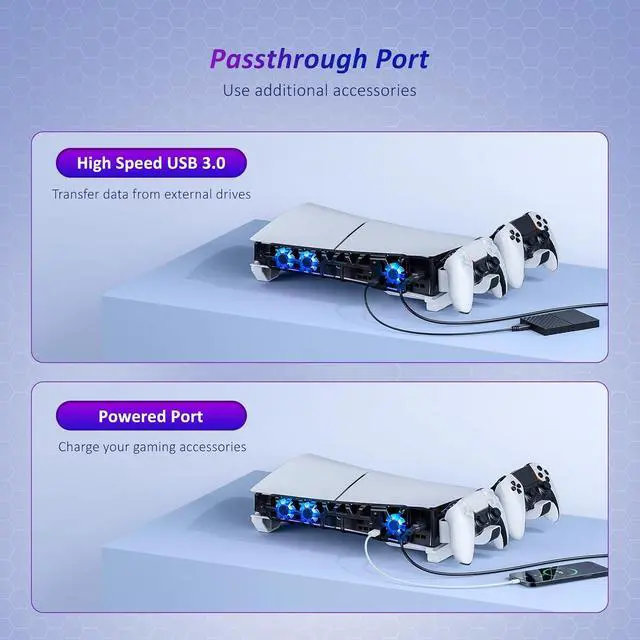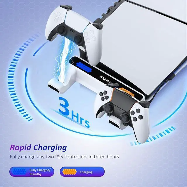 Screw-In Charging DockFully charge two Dual_Sense or Dual_Sense Edge controllers in only three hours. The included charging dock is powered by your PS5 Slim. Screw it directly into the mounting hole on the bottom of your console for a secure and space-saving fit.