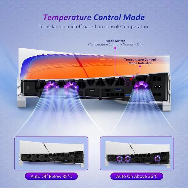 Temperature Control Fans Press the button on the included fan attachment to alternate between Temperature Control Mode, fully on, and fully off. In temperature control mode, the speed of the fans will change dynamically as the console temperature fluctuates, turning off below 35°C and turning on above 36°C.