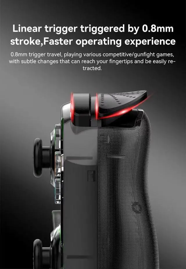 Feature: Multi-Platform Compatibility - Support for Android iOS iPhone PS4 Switch Steam PC function. For Android Custom Settings Button - Built-in preset configuration can be used directly, or you can customize the button settings. One-click macro operation - macro definition, one-click display of heroes. Set of combos, famous sword resurrection armor, one-click operation. Ergonomic, Curved Design - Professional grip design, firm handle. Convenient and fits the hand. Innovative two-stage stretch structure - portable and compatible with large-screen mobile phones, stable and not loose. Can stretch 135-173mm/5.31-6.81in. 360° high-precision 3D joystick - no slippage. Adopt a million-time life high-precision rocker without dead zone. One-click speed adjustment, easy micro-manipulation and aiming - The M2 key on the back can realize speed adjustment, assist players to complete a series of difficult operations such as fine-tuning, aiming, headshot, etc., making it easier for you to get started and lock the game. Long-lasting battery life - game while charging, built-in 400mAh large battery, and the external Type-C charging handle is continuously charged. Exquisite details - Delicate keys: The keys are processed with backlight, the target is clear, not dazzling, and the key span is small and easy to operate; borderless design: allows us to adjust the volume and other issues more easily in the game; upgrade groove design: product placement There is a 1.3mm concave at the mobile phone, which can effectively protect your mobile phone camera and prevent the camera from scratching.
