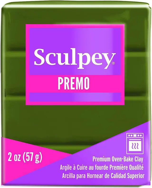 Premo Polymer Clay. Spanish Olive. This remarkable clay quickly reaches a workable state (with a minimum of conditioning) and remains soft and pliable while offering extra resistance without crumbling. The artists' color palette is great for color mixing and blending. Premo Sculpey is not brittle after baking, great for millefiore with a firm smooth texture, is non-toxic, and comes with a vast color palette (each sold separately). This package contains 2oz of Premo Sculpey Polymer Clay. Made in the USA.