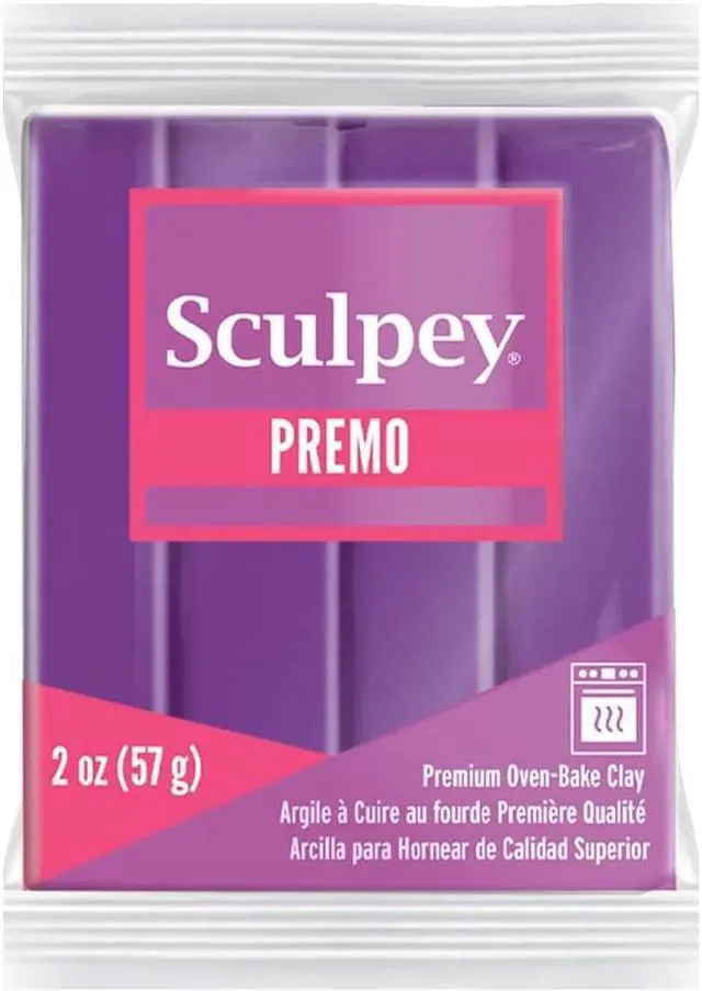 Premo Sculpey Polymer Clay. Purple Pearl. This remarkable clay quickly reaches a workable state (with a minimum of conditioning) and remains soft and pliable while offering extra resistance without crumbling. The artists' color palette is great for color mixing and blending. Premo Sculpey is not brittle after baking, great for millefiore with a firm smooth texture, is non-toxic, and comes with a vast color palette (sold separately). Each package contains 2 ounces. Made in the USA.