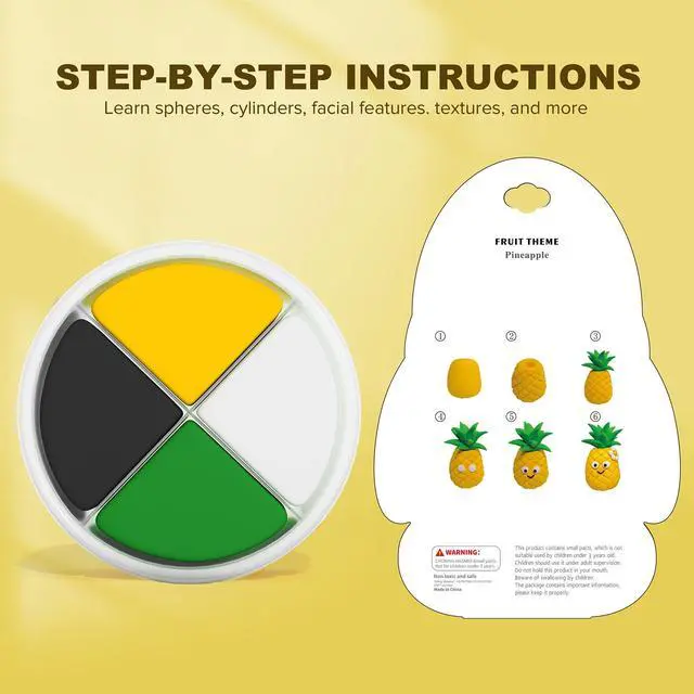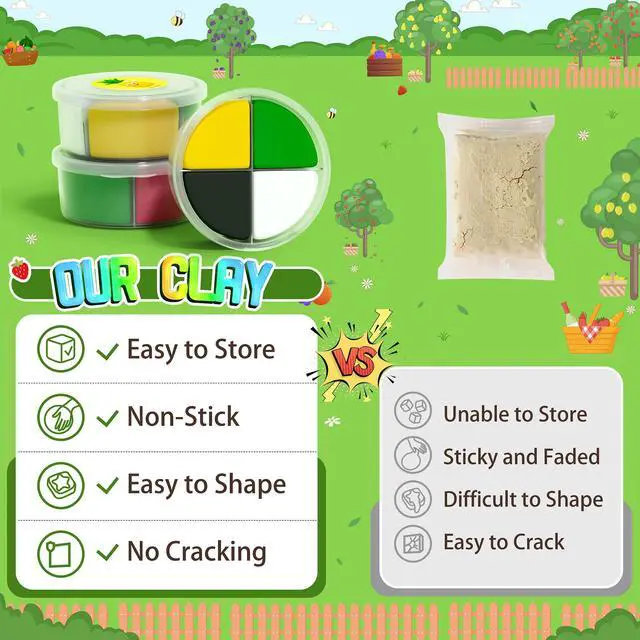 Fruit Theme Clay Kit: Unleash creativity with our complete air-dry clay set! Includes 12 individual boxes of premium clay (each with 4 vibrant colors), 4 sculpting tools, and step-by-step tutorials. Easily craft 12 lifelike fruit models using illustrated guide cards. The innovative compartment box keeps colors separated, and leftover clay stores neatly in the sealable containermess-free fun anywhere!