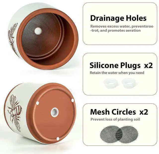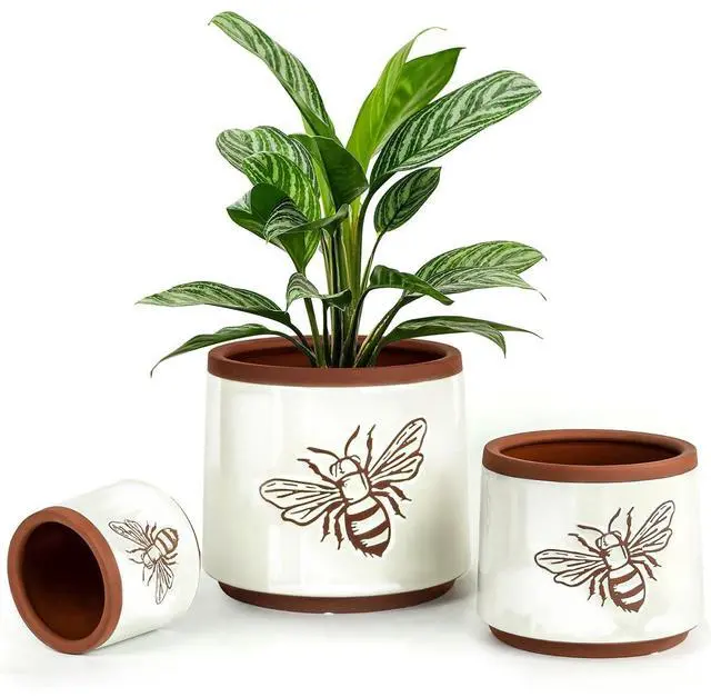 YBX Terracotta Pots Inch with Drainage Holes, Bee Decor, Ceramic Pots for Indoor Plants Flower Pots Outdoor, Succulent, Herbs, Snake Plants (White, 8+6+4 Inch)
