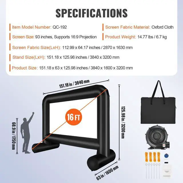 Screen Size: 93 inches, Supports 16:9 Projection