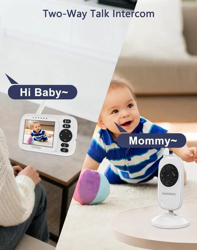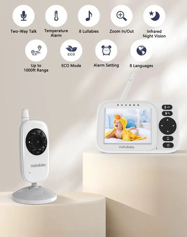 - HelloBaby HB2438 upgrade Video Baby Monitor has many features, such as Two-way Audio with Your Baby, Temperature Monitor, Feeding Timer Alarm, 2x Digital Zoom, Manual Pan & Tilt Review Angle, Infrared Night Vision, Sound-activated Mode, Range up to 1000ft(305m), 8 lullabies, 8-language Setting, 3.2-inch(8.13cm) IPS screen.