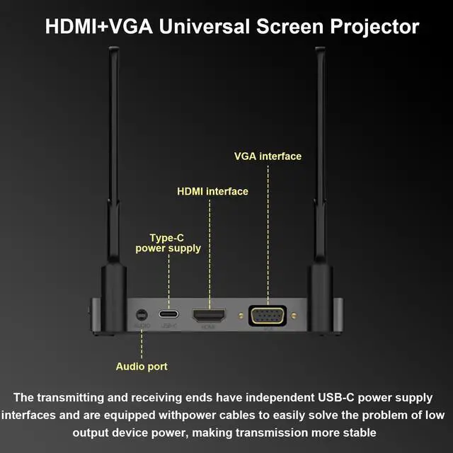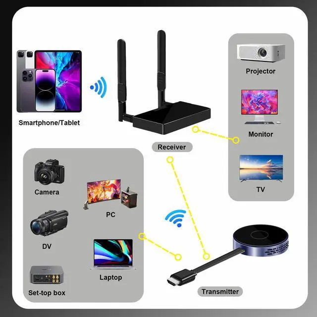 Designed for high performance, the wireless transmitter features a high-sensitivity antenna that effortlessly transmits uncompressed high-definition video and digital audio, ensuring a flawless media experience. Setting up the system is incredibly easyno apps, software, or WiFi connection is required. Just connect the transmitter to your HDMI source, hook up the receiver to your display device, power up, and you'll be ready to go in just 20 seconds with a true plug-and-play experience. Plus, with its compact design and absence of cumbersome cables, you can easily carry and use the system wherever you need it.
