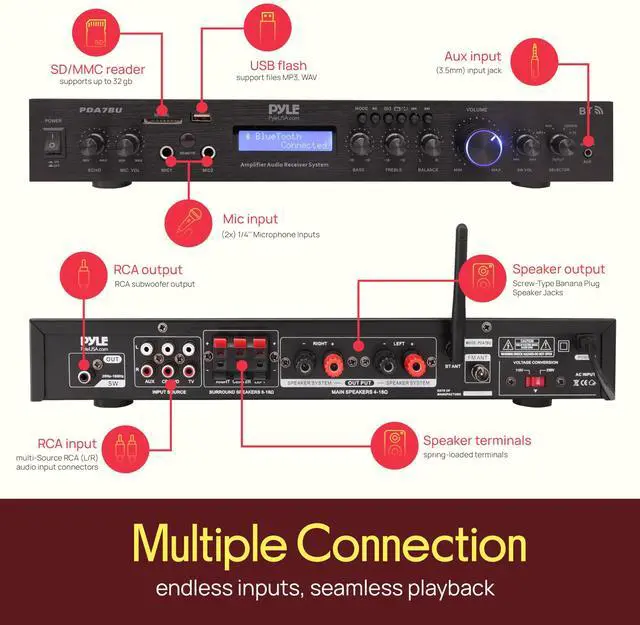 | Connectivity Technology | USB flash and SD memory card readers, 3.5mm aux input jack, RCA audio connectors |