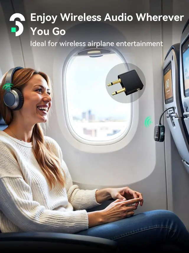 - [Wide Compatibility & Versatile Use Cases]This Bluetooth adapter for airplane is compatible with a wide range of devices via 3.5mm AUX input/output, including TVs, PCs, car audio systems, and airplane media consoles. Whether you are at home, on the road, or in the air, enjoy wireless audio wherever you go.