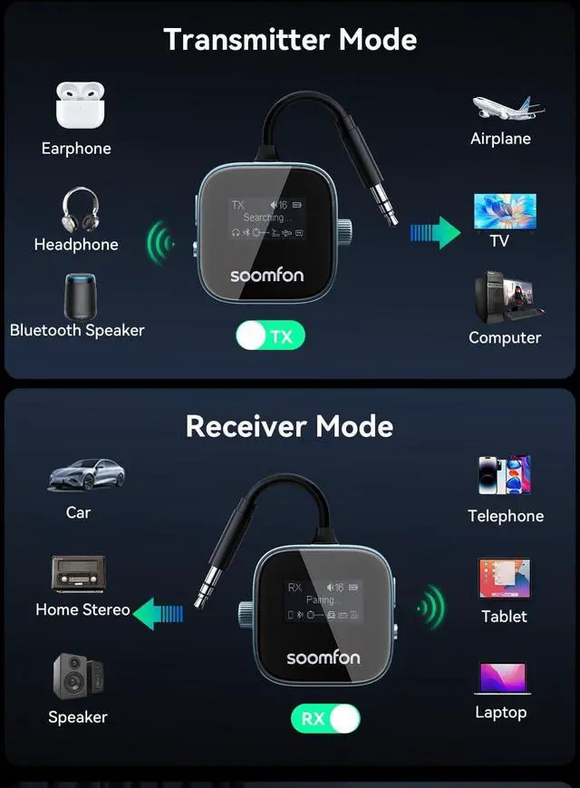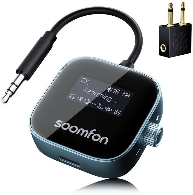 Take your in-flight entertainment wireless with the SOOMFON airplane Bluetooth adapter for headphones. This compact Bluetooth adapter for airplane use connects to airline seatback screens and transmits audio to your Bluetooth headphones, eliminating the need for wired earbuds. With support for Bluetooth 5.3, dual headphone pairing, and a clear LCD screen, it's the ideal Bluetooth transmitter for airplane travel. It also works as a receiver in cars or at home via 3.5mm AUX. Whether you're flying, commuting, or relaxing, this Bluetooth transmitter and receiver for airplane ensures a stable, wireless audio experienceperfect for frequent flyers and travel lovers.