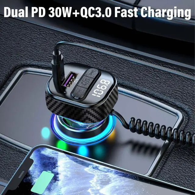 Bluetooth 5.3 FM Transmitter for Car, Bluetooth Car Adapter with Type-C PD (30W) Charger Port and Cable, QC 3.0 USB Port, Wireless FM Radio Transmitter, Support Handsfree Calling, Backlit, U Disk, Black