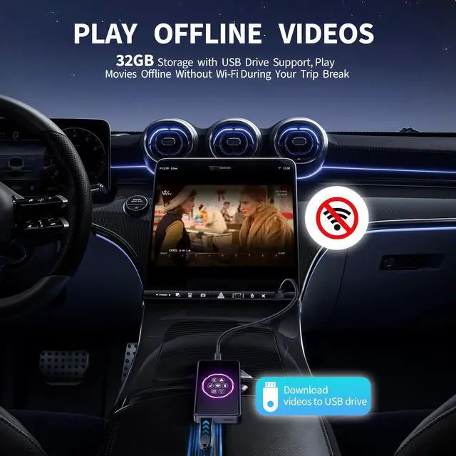 32GB storage with USB drive support:Equipped with 32GB of memory and high-speed file transfer, allowing you to upload and play your favorite movies via USB drive during your trip in offline mode, without the need for a Wi-Fi connection.