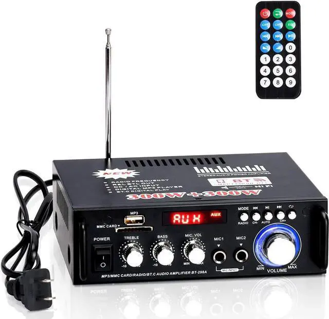 Wireless Bluetooth 5.0 Stereo Audio Amplifier, 300W+300W Dual Channel Power Sound Receiver w/USB, SD Card, FM Radio for Home Speakers & Theater System with Remote Controller - US Plug