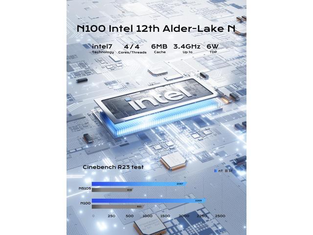 - N100 Processor:This UN100P Mini PC is equipped with the latest 12th Gen Intel Alder Lake N100 Processor((4C/4T, 6M Smart Cache, up to 3.4GHz), the performance is 25% higher than N5105 Processor.