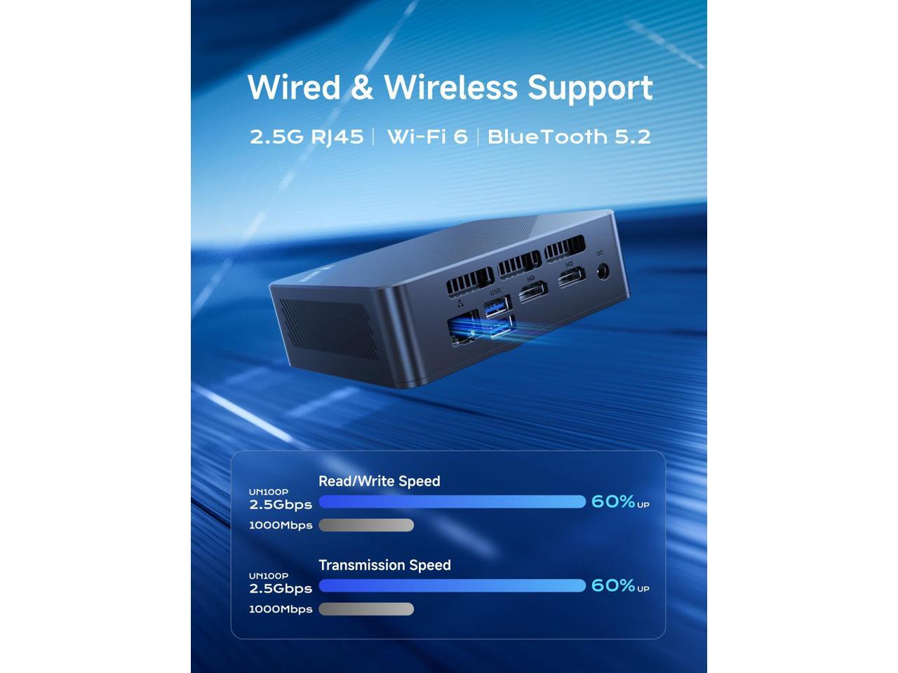 - Stable Network Transmission: UN100P mini desktop computer with 2.5G RJ45 ethernet port, outputting stable and strong network signal, with WiFi6E and BT5.3, it can significantly reduce the host's CPU load.
