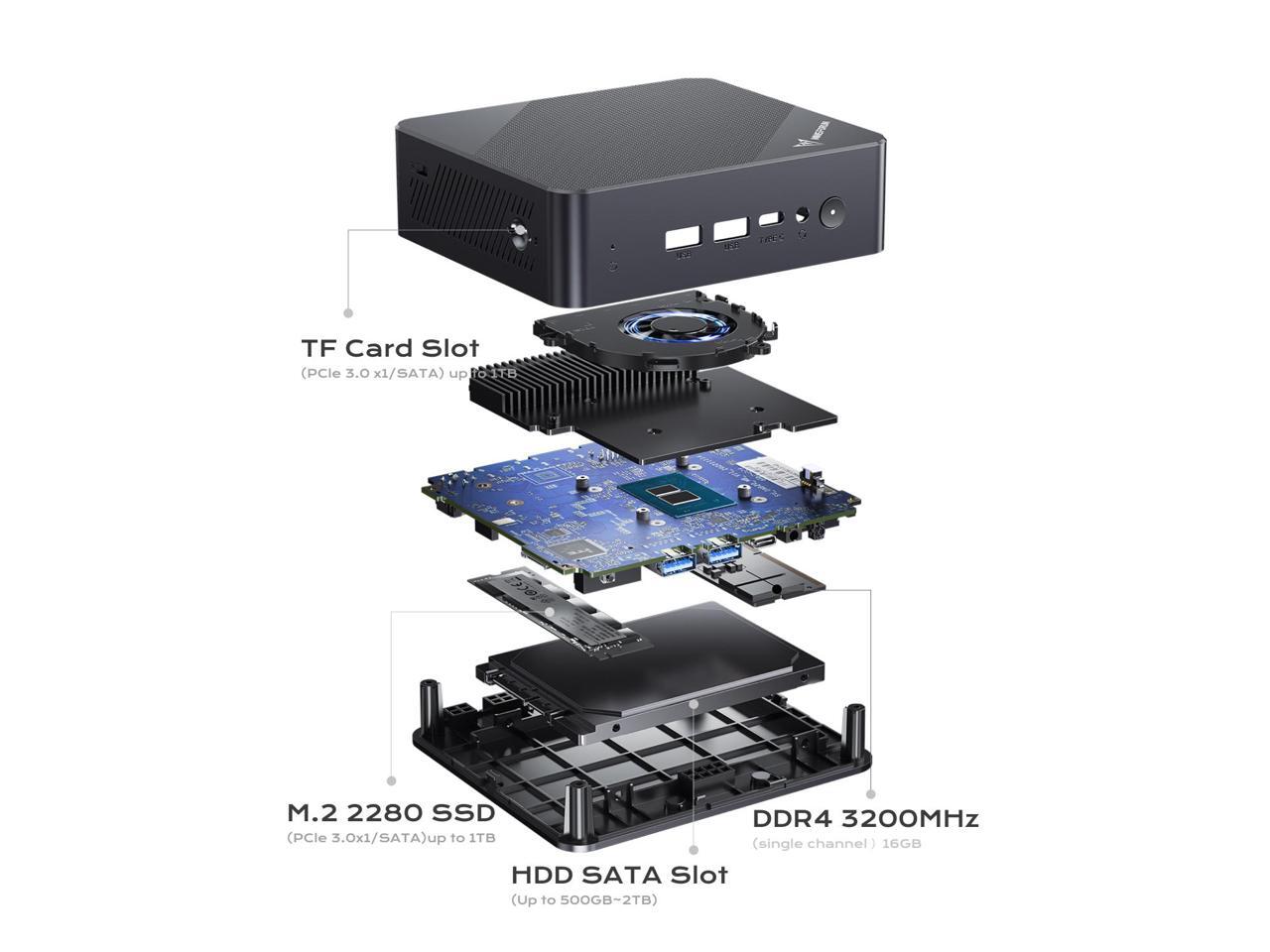 - Expandable Capacity: This Mini PC has pre-installed 16GB DDR4(3200MHz) RAM and 512GB M.2 2280 SATA SSD, you could replace the SSD up to 2TB. There is a 2.5inch SATA HDD slot is available, you could install a 2TB HDD by yourself and the TF Card slot also allows you to expand more storage.