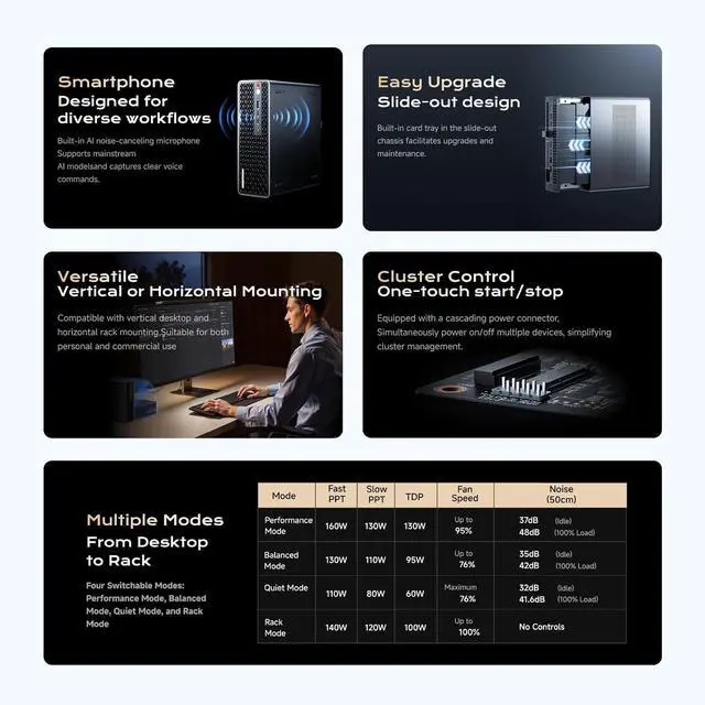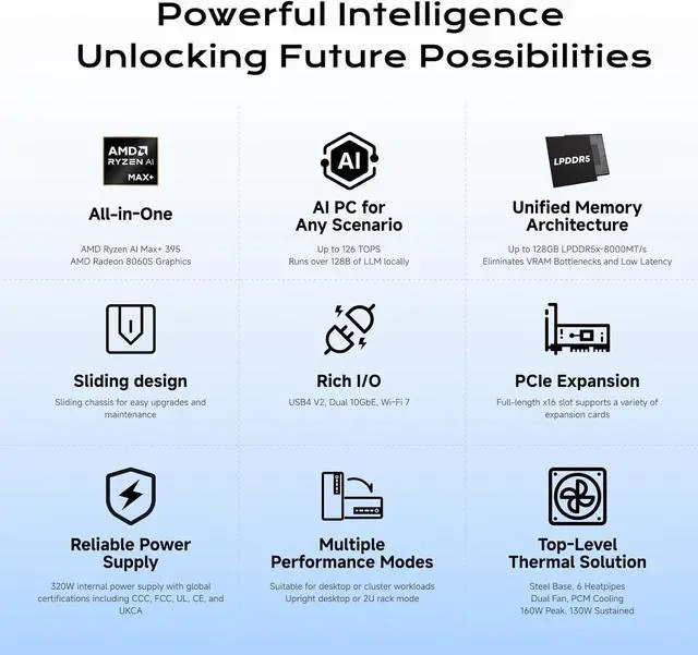 Large Storage & Flexible ExpandabilityThis Workstation equipped with 128GB LPDDR5-8000MHz + 2TB M.2 2280 PCIe4.0 SSD. There is another PCIe4.0 SSD slot available for up to 8TB, these SSD slots are compatible with RAID0 and RAID1, you can store movies, videos, photos, important files easily. Whats more, it also comes with 1x standard PCIex16 slot(PCIe4.0x4) inside.