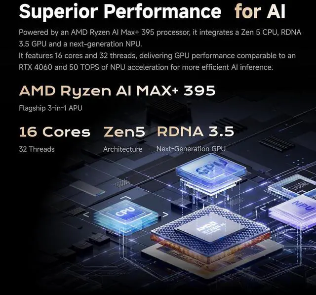 Leading AI Mini WorkstationMINISFORUM AI MS-S1 Max Workstation comes with AMD Ryzen AI Max+ 395 processor, which uses AMD's latest generation Zen 5 architecture. It has 16 Cores and 32 Threads, the boost clock is up to 5.1GHz. The overall processor performance is up to 126 TOPS, and the NPU performance reaches up to 50 TOPS. AMD Ryzen AI enables improved productivity, advanced collaboration, and improved efficiency.