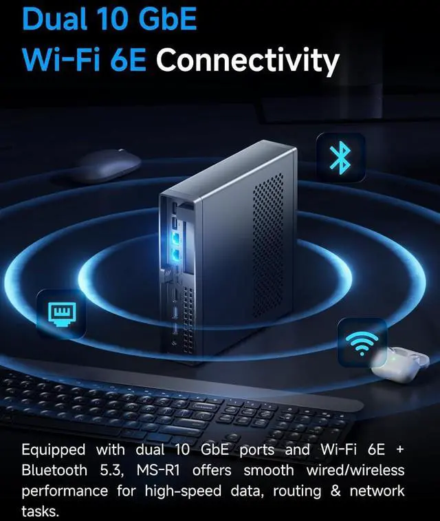 Blazing-Fast & Stable NetworkingThis Workstation comes with 2× 10GbE RJ45 ports, the enterprise-grade wired performance for high-speed data transfer, routing, and network-intensive tasks. Wi-Fi 6E + Bluetooth 5.3 can Rock-solid wireless connectivity for ultra-low-latency collaboration and seamless home/office network integration. Perfect for scenarios demanding lightning-fast transfersfrom real-time 4K streaming to large-file backups.
