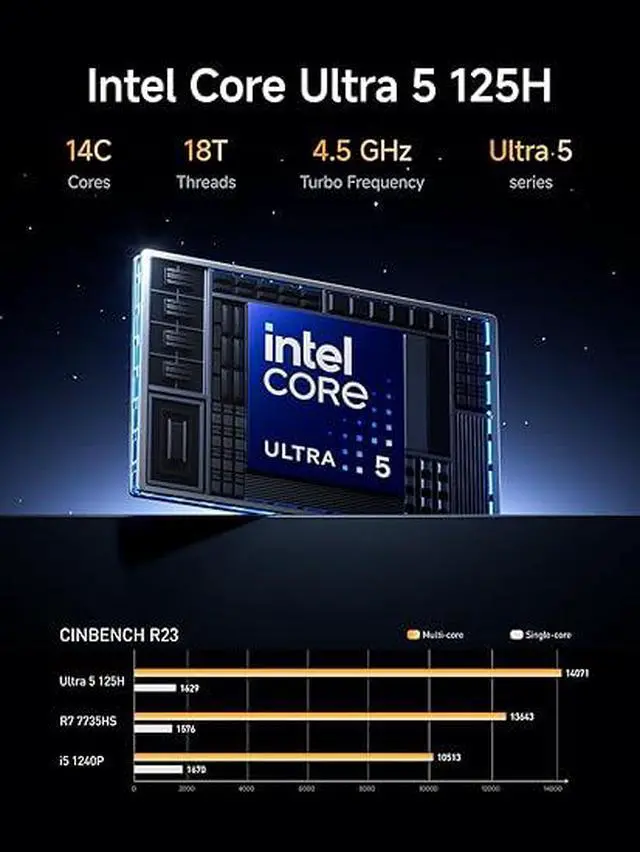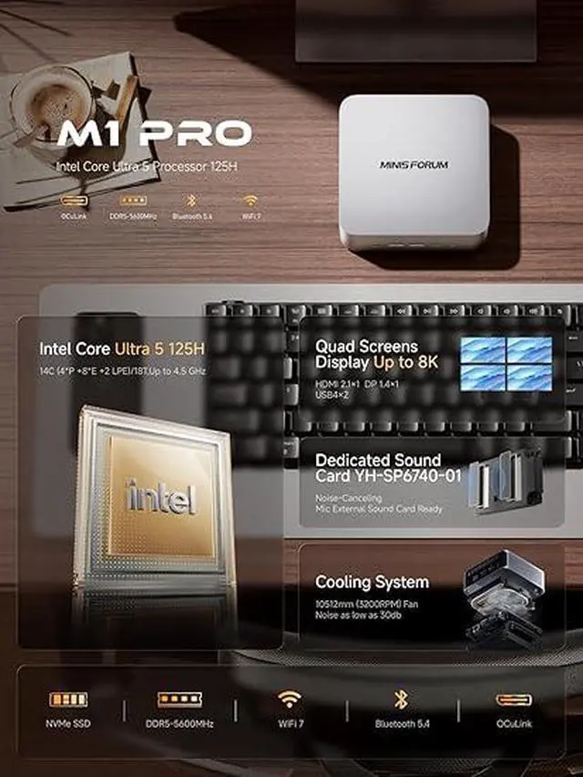 Intel Core Ultra 5 125H ProcessorMINISFORUM M1 Pro Mini PC is powered by the Intel Core Ultra 5 125H processor (14 cores, 18 threads, 18MB Intel Smart Cache, up to 4.5GHz) with integrated Intel Arc Graphics, delivering exceptional multi-threaded performance and smooth HD graphics processing. It effortlessly handles demanding office tasks, light gaming, and multimedia editing.