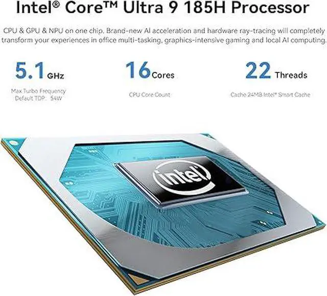 The newest Intel AI CPU and User Friendly DesignBeelink mini pc equips with the newest Intel Core Ultra 9 185H(16-Core,22-Threads)18MB Intel Smart Cache, up to 5.1Ghz, which gives you the fastest and smoothest enjoyment, and is ideal for playing Plex Media Server, business and education. It also is User Friendly Design. The portable compact computer size and minimalist appearance, make your life away from chaos. Our whole machine is electricity cost saving.