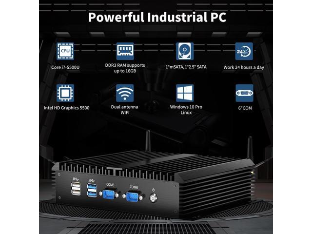 BOESIIPC Fanless Mini Industrial PC, Desktop Computer i7-5500U Windows 10 Pro, 16GB RAM 256GB SSD, 2xNICs, 6*COM RS232, 4xUSB3.0, 2.4G+5G WiFi, HDMI/VGA Ports, Gigabit LAN, Auto Power On