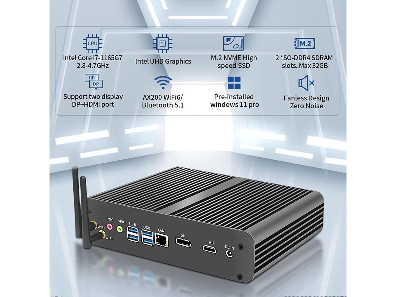 - [Powerful Performance] Mini desktop computer equipped with Core i7-1165G7 and Iris Xe Graphics, 4 Cores 8 Threads, base frequency: 2.8GHz, max 4.7GHz, 12MB L3 cache. Pre-installed with Windows 11 Pro (64bit) OS, Also supports windows 10 Pro and Linux OS. Buid AX200 wifi 6 and bluetooth5.1