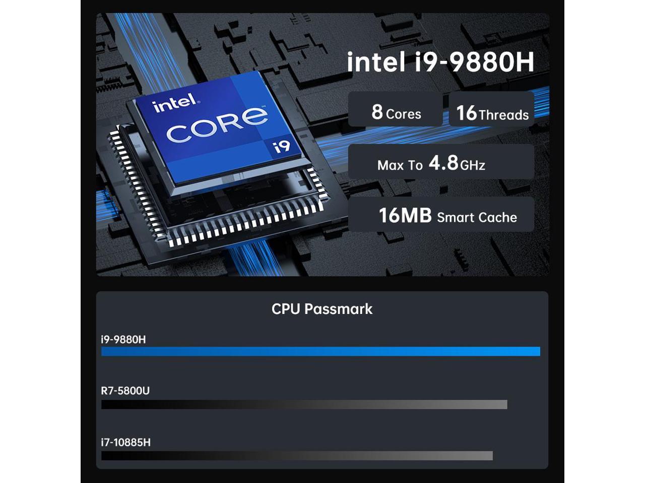 - Core i9-9880H CPU with Win11 Pro OS- Equipped with the Intel Core i9-9880H processor and UHD Graphics 630, this mini PC boasts a 2.3GHz base,max 4.8GHz, 16M smart cache, 8 cores 16 threads, and TDP 45W.