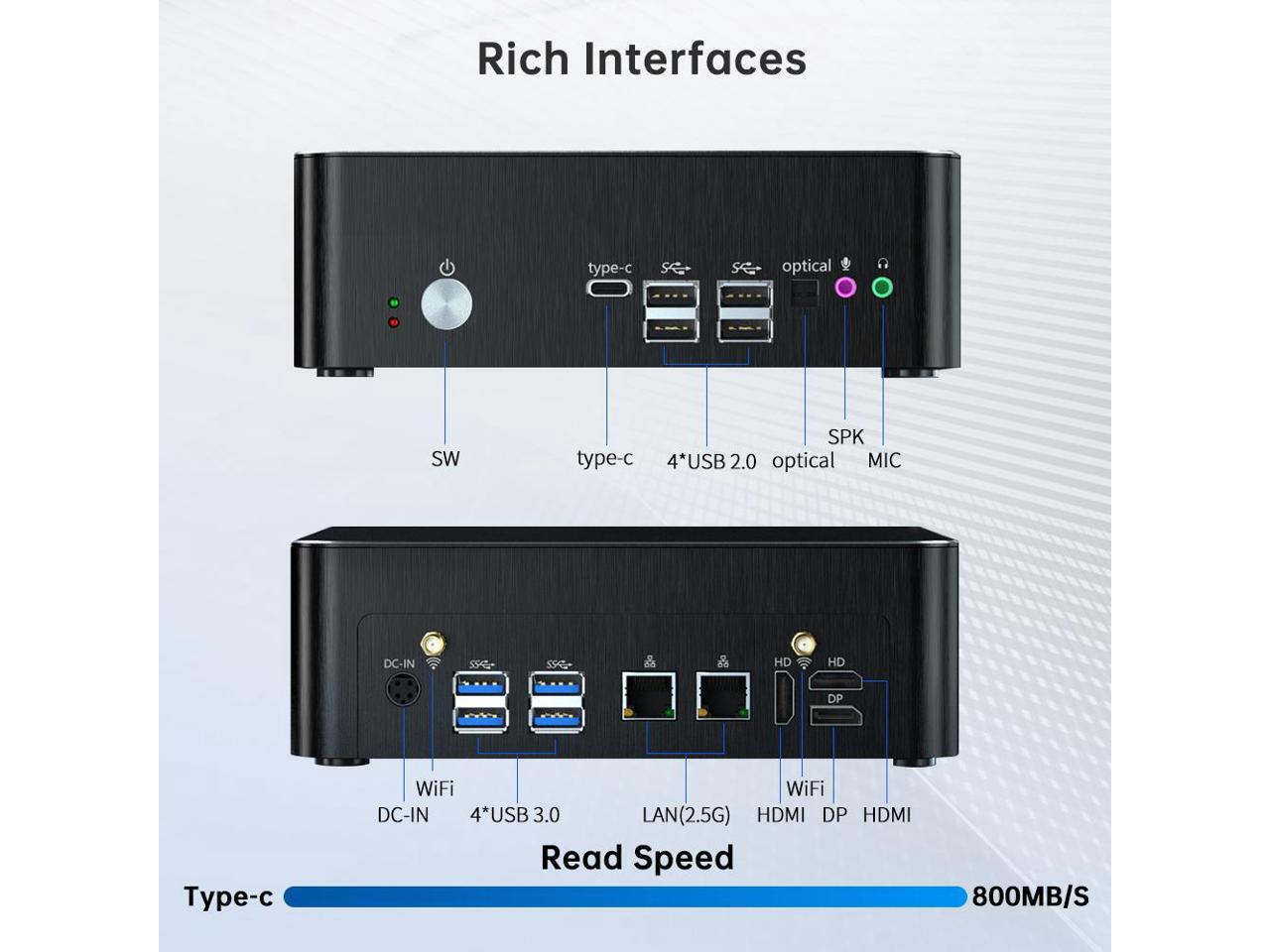 - WiFi6E and Dual 2.5G RJ45 Ports- Equipped with dual 2.5Gbps LAN ports,It also features AX210 WiFi6E and Bluetooth 5.3, 4 USB 3.0 ports, 4 USB 2.0 ports, 2 RJ-45 2.5G LAN ports, 1 DP port, 2 HDMI ports, 1 DC IN, 1 Type-C, 1 optical interface, 1 SPK, and 1 MIC.