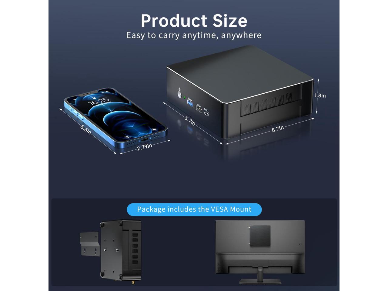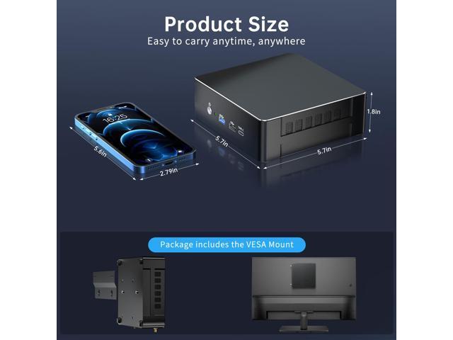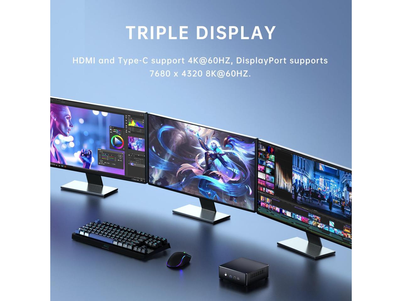 - Triple Display: Mini PC supports easy connection to three-monitors via 1-DP & 1-HDMI and Type-C ports, (HDMI and Type-C support 4K@60HZ, DisplayPort supports 7680 x 4320 8K@60HZ.