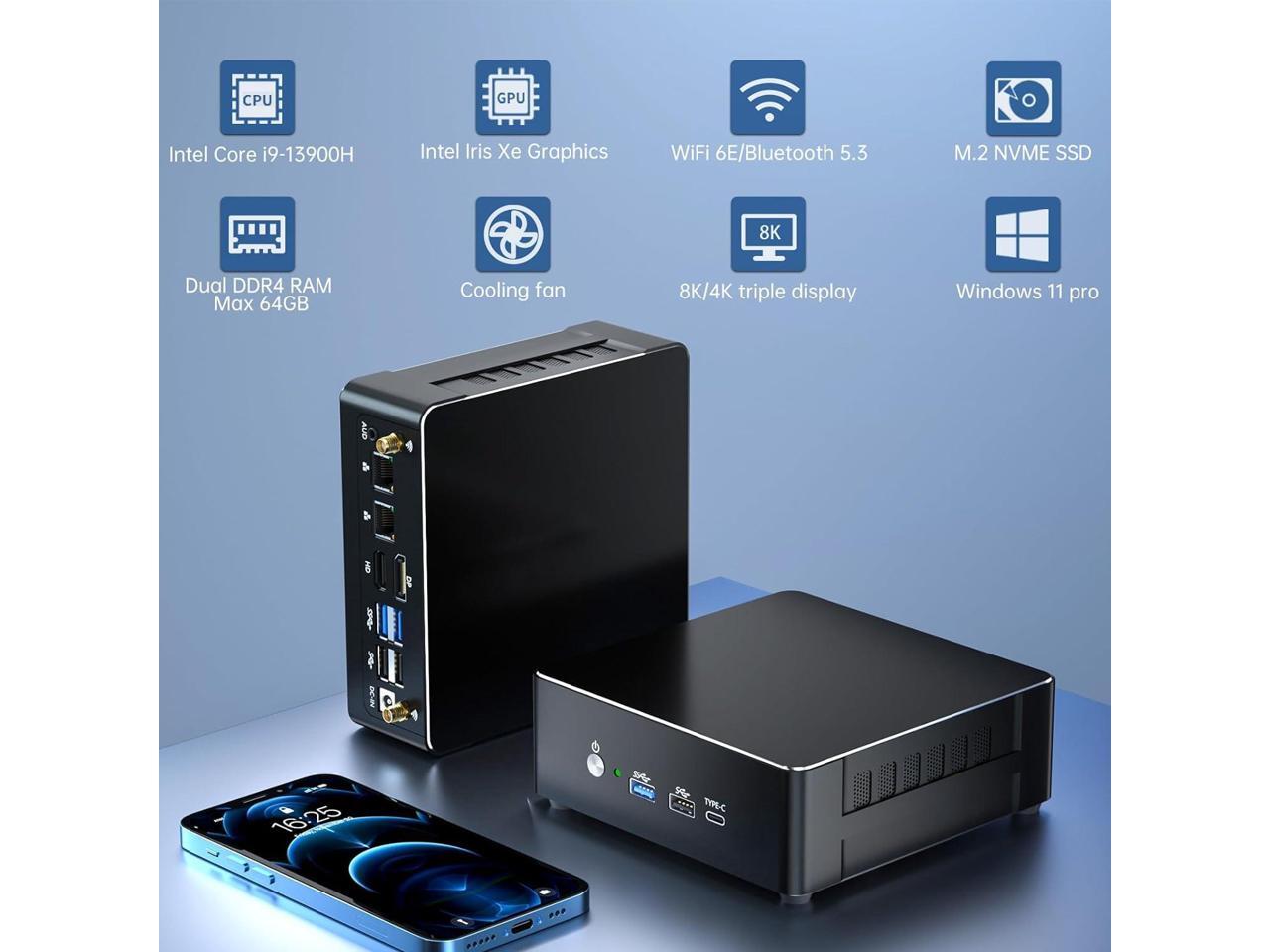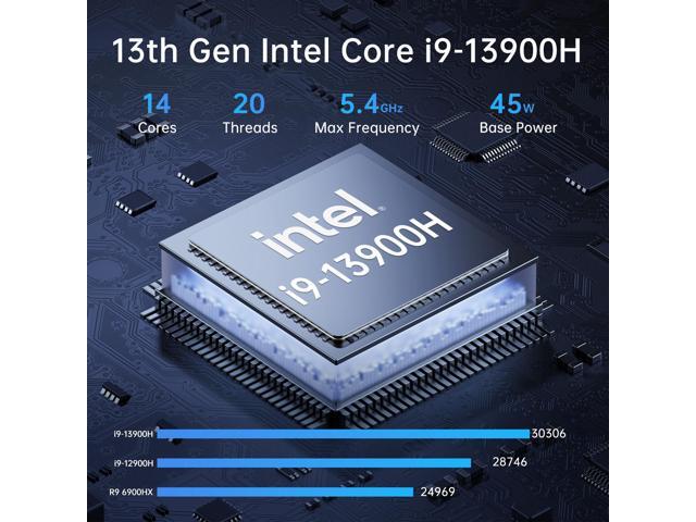 - Powerful 13th Gen Performance Mini PC: Mini pc is powered with core i9-13900H processor, 14 Cores 20 Threads, 24MB smart cache. Max Turbo Frequency is 5.4GHz.