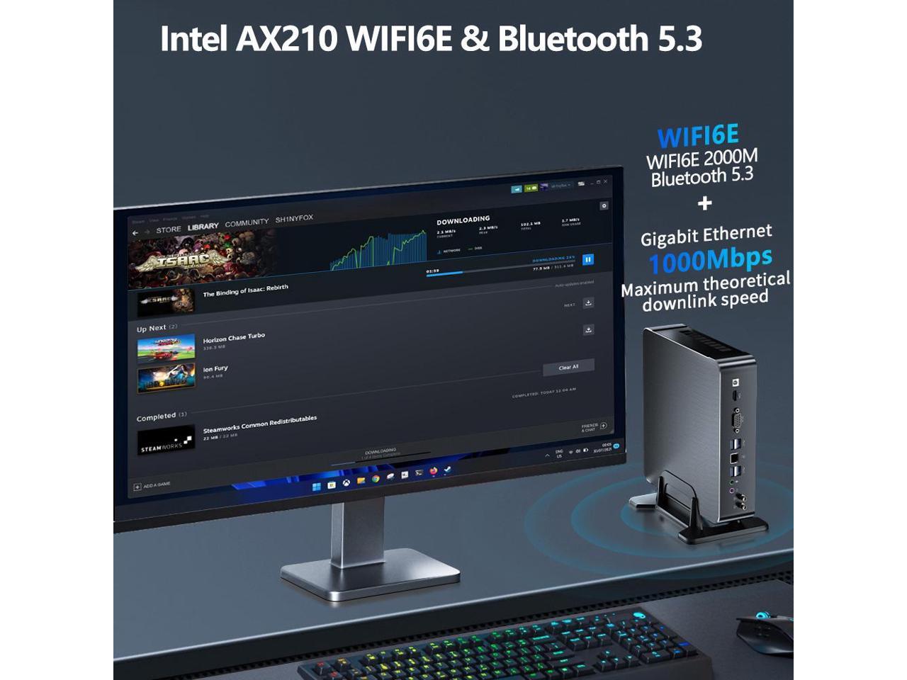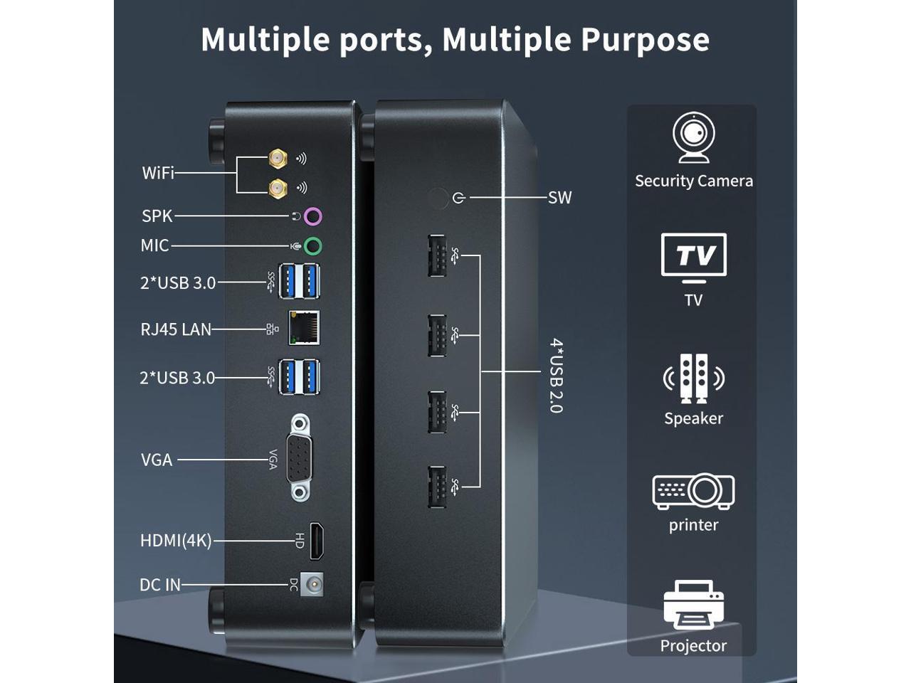 - Multi-function Interface & Efficient Heat Dissipation: 4 * USB3.0, 4*USB2.0, 1*HDMI, 1*VGA, 1 x SPK&MIC(3.5mm), 1 x RJ-45 Giga LAN port, 1 x DC IN. built-in AX210 Wifi 6E and Bluetooth 5.3, 1*2.5Gbps/1000M LAN Ethernet port.