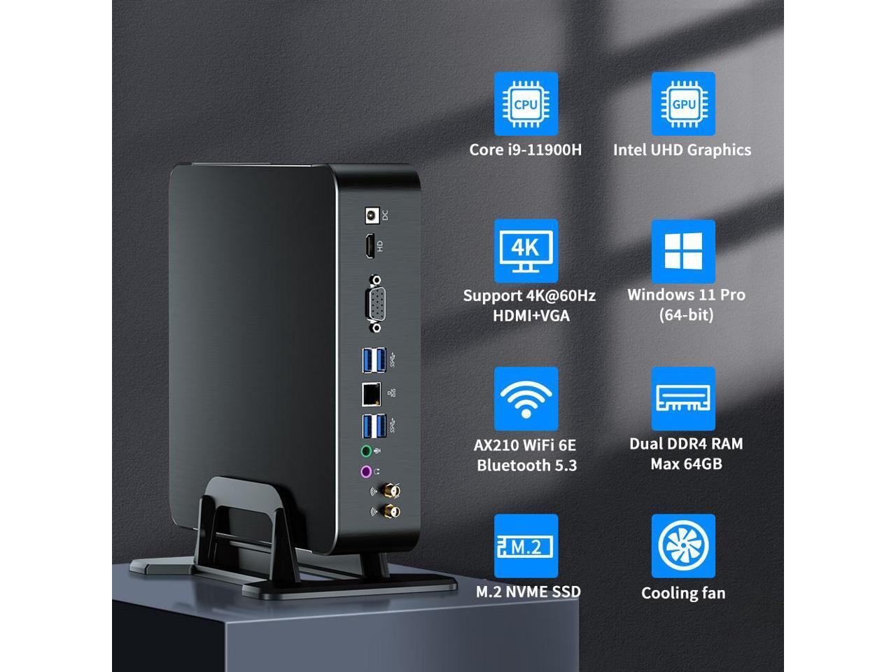 - Powerful Performance Mini PC: Mini pc is powered with core i9-11900H processor, 8 Cores 16 Threads, 24MB smart cache. Max Turbo Frequency is 4.9GHz. Pre installed with Win 11 Pro.