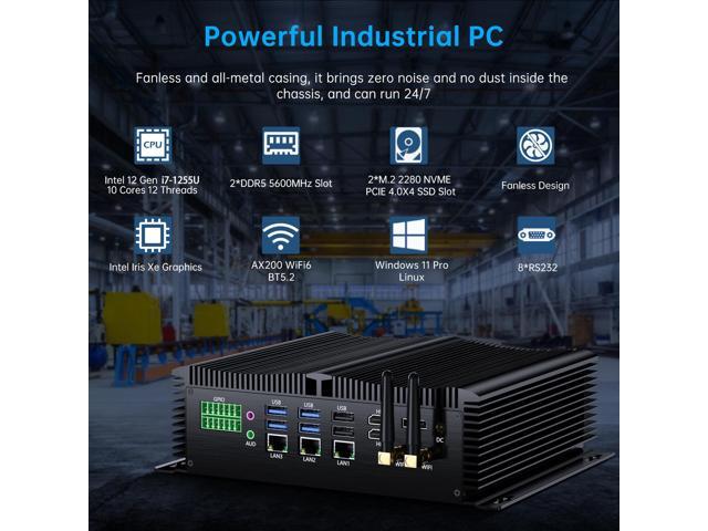 BOESIIPC Industrial Mini Pc with 12th Gen Core i7-1255U(10C/12T), 32G DDR5 RAM 1T Pcie 4.0 SSD, WIFI6, BT5.2, 4xUSB3.0, 3x2.5G LAN, 8xCOM, SIM, GPIO, P/S2 Ports, Win 11 Pro Fanless Computer
