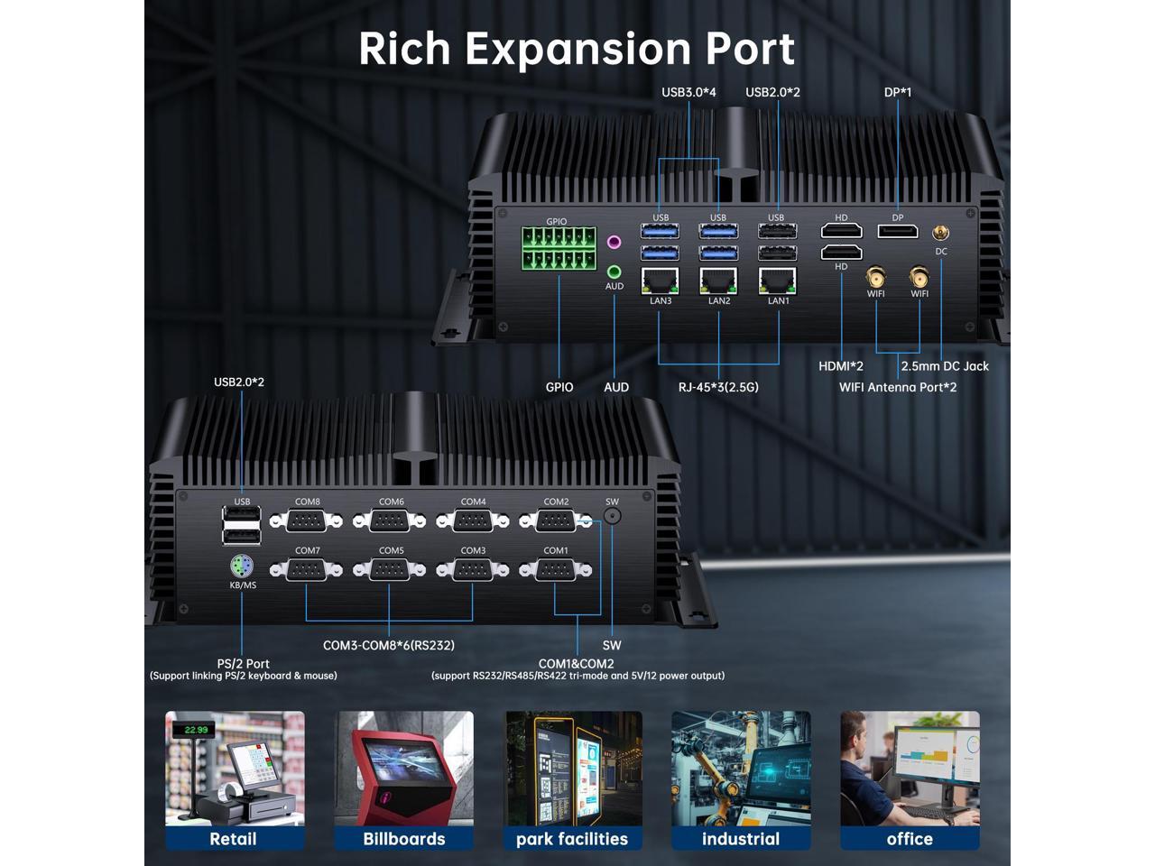 - [Rich Ports] GK9000 Industrial Pc equipped 8xCOM RS232 ports(COM1 and COM2 supports switching to RS232, RS422, RS485 via bois.), 1xP/S2, 1xGPIO, 4xUSB 3.0, 2xUSB 2.0, 3x2.5G LAN, AX200(WIFI6&BT5.2), 1xMIC & SPK, three monitor support via 2xHDMI(4K@60Hz) & 1xDP(4K@60Hz) Ports.