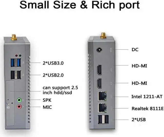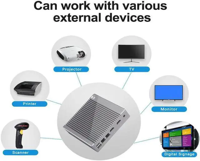 1. The fanless mini pc comes with 2x HDMI port and Intel HD graphics, supports 2 monitors to improve your working efficiency. This windows 10 mini pc also supports 6x USB port to connect various peripherals, such as printer, projector, scanner, etc.