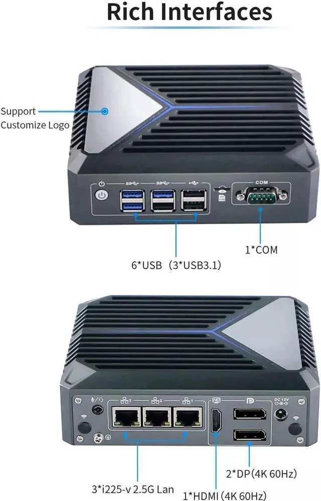 Ports: 1*HD Port, 2*DP Port, 3*USB3.1, 3*USB2.0, 1* COM, 1*SIM card slot, 3*2.5G Lans, 1*Audio(Mic and Speaker)