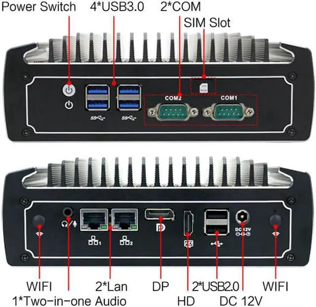 I/0 Port: SW, 4 x USB 3.0, 2 x COM COM1 COM2 for RS232/RS485, SIM Slot, DC_IN, 2 x USB2.0, HDMI, DP, 2 x LAN, Audio